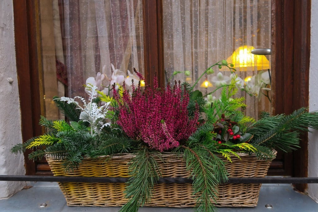 The idea of window baskets traveled with the settlers to America and remain popular in places like England, Italy, Holland, and Germany. Most of these photos were taken in Rothenburg, a town that revolves around Christmas.