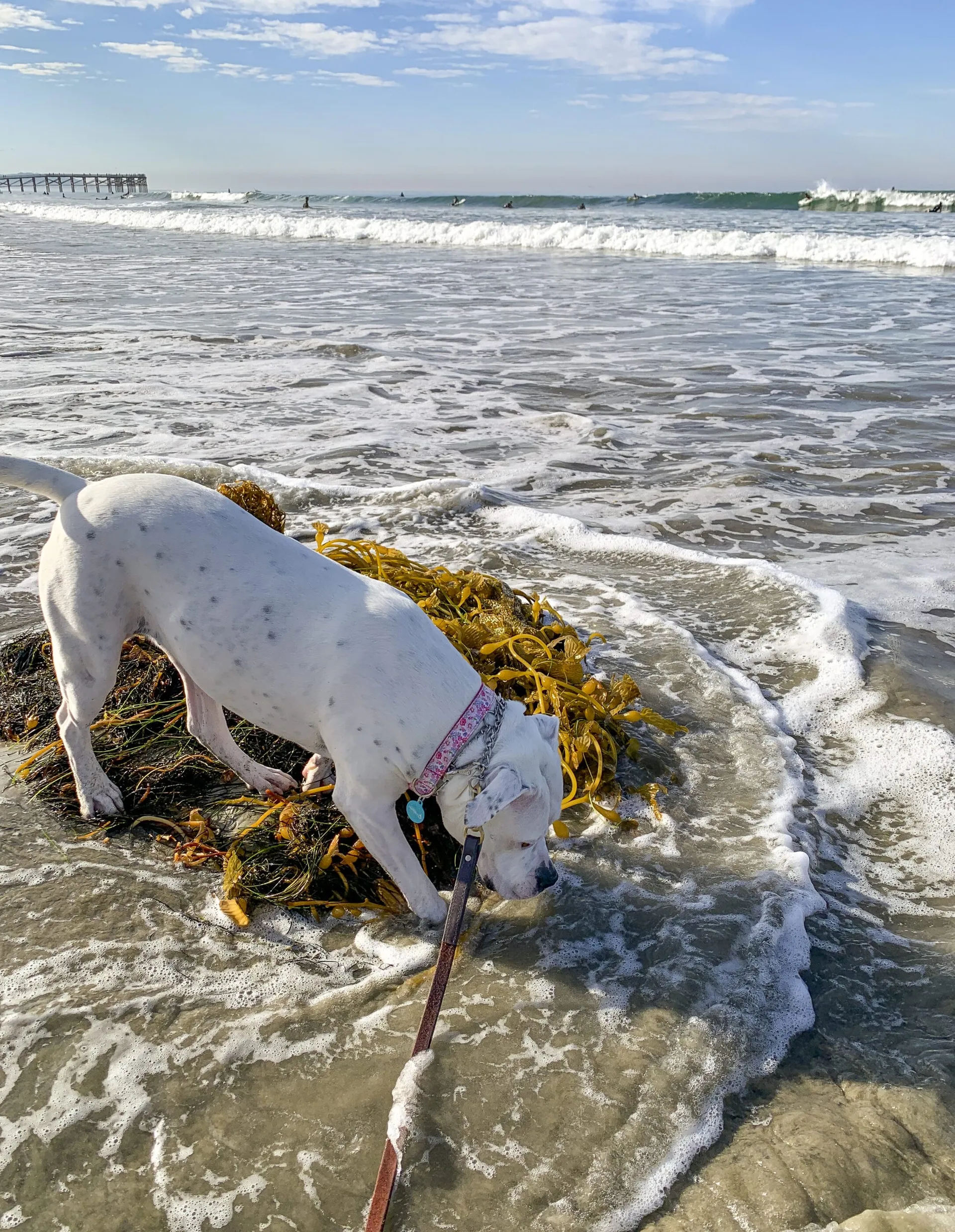 San Diego County implemented a new testing system for ocean water quality that you can check at sdbeachinfo.com. You’ll see green markers where the ocean is open, red markers where the ocean is closed for swimming and yellow warning markers. You will not want your dog to enter the water in places where you see a red or yellow marker.