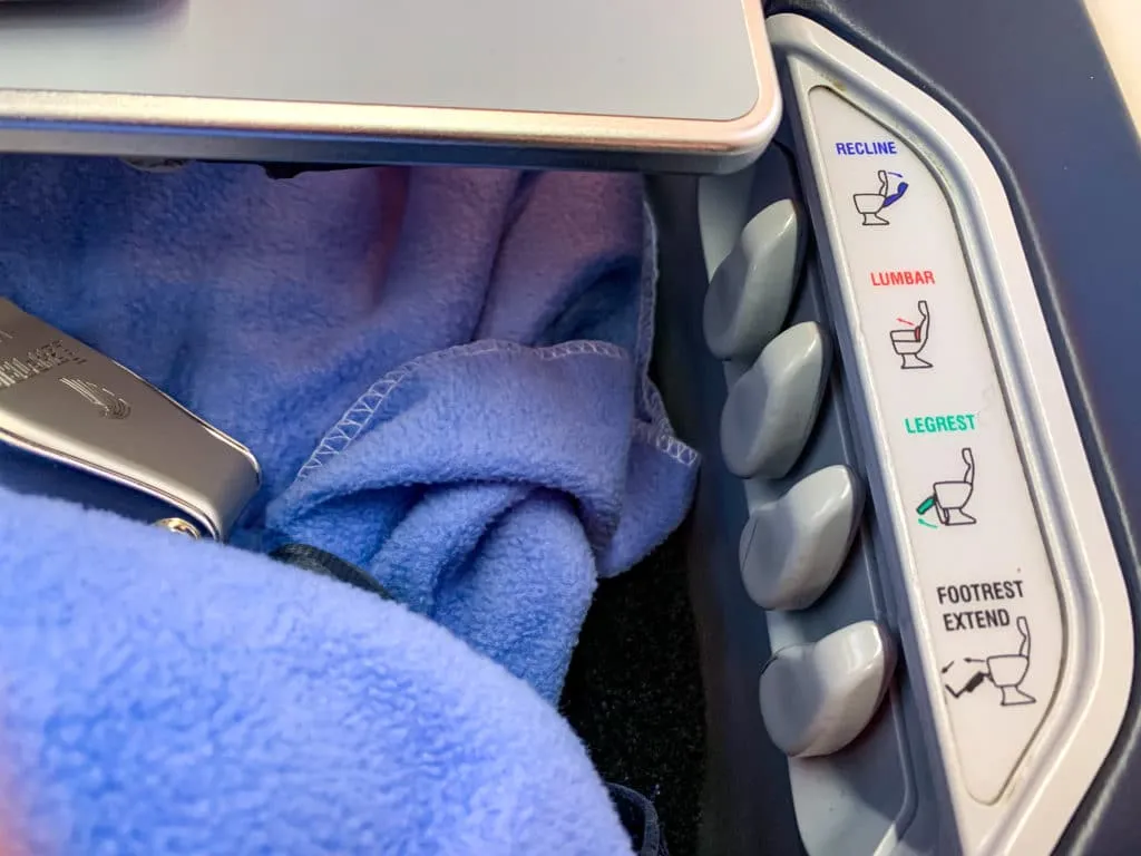 A bottle of water, headphones, duty-free shopping catalog, and in-flight magazine were tucked into the seat pocket in front of us. A pillow and blanket were also placed on the seat. I did try to extend my footrest but it was a bit short for my longer American legs with the tray table open.