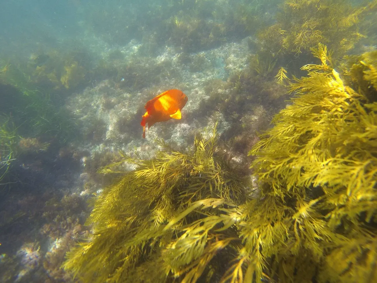 From your kayak, orange garibaldi fish (California’s state fish) are very easy to spot, as are some smaller fish swimming near the surface.