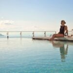 As you can see in the above photo, the scene changes with the weather: moody and dramatic in the mist, golden and glowing at sunset. Poolside service is available during warmer months, and cozy loungers make it an appealing spot even in cooler seasons.