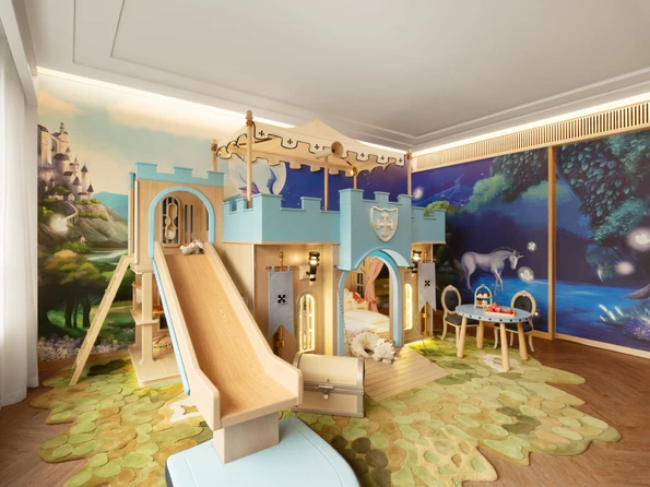 | Enchanted Castle Themed Family Suite | 82 sqm / 883 sq ft | 5 guests | King + Bunk Bed + Murphy Bed | A magical castle suite featuring an interactive play bunk bed, a mural with hidden UV elements, and a role-play area |
