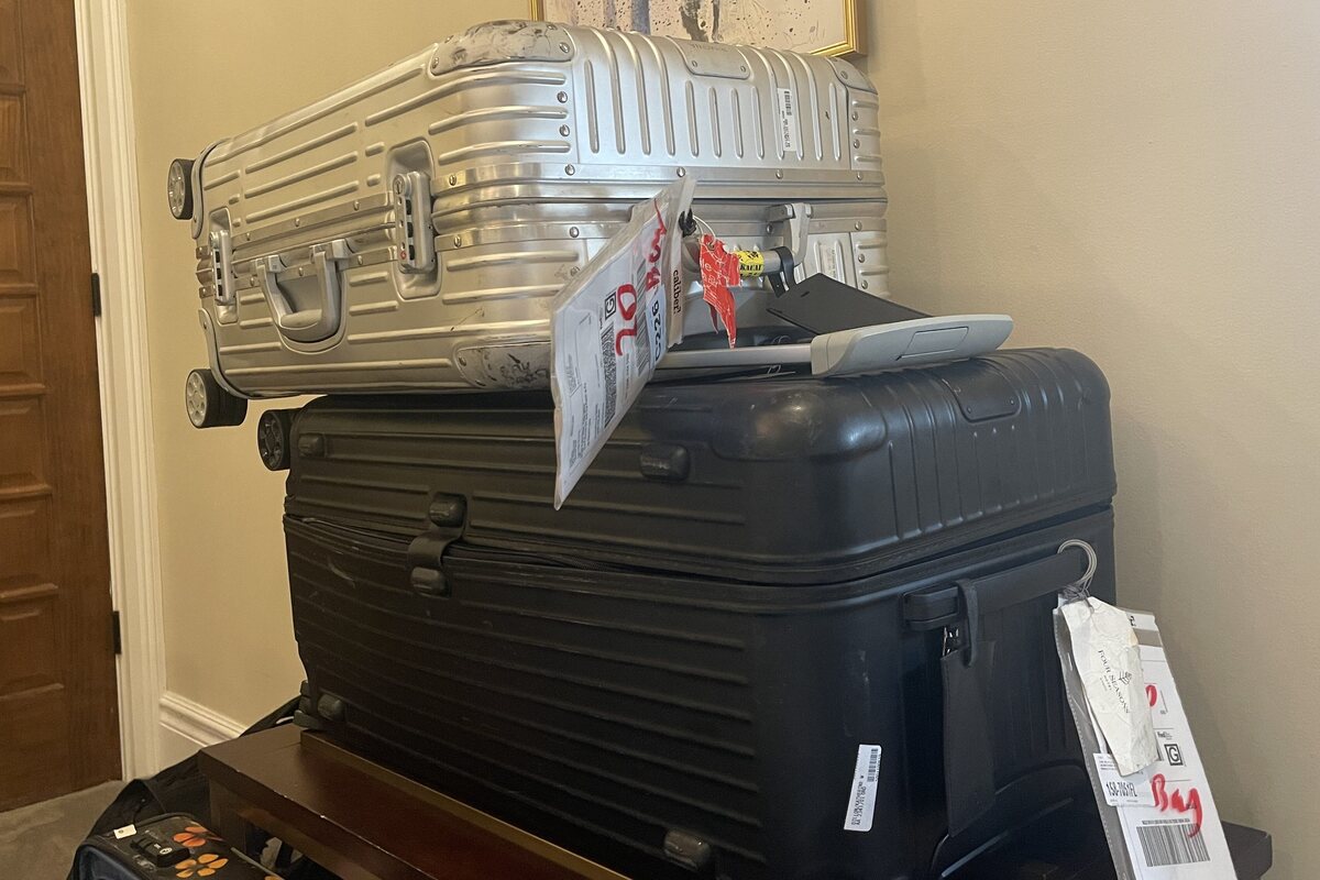 We own multiple pieces. While I love the high-end look of the silver Original Line, my favorite piece is the less-expensive Essential Trunk Plus because it has a zipper and more flexible “skin.” Rimowa is an investment and does ding/scratch like other hard-shell luggage but we’re happy (and love the stickers/customization options).