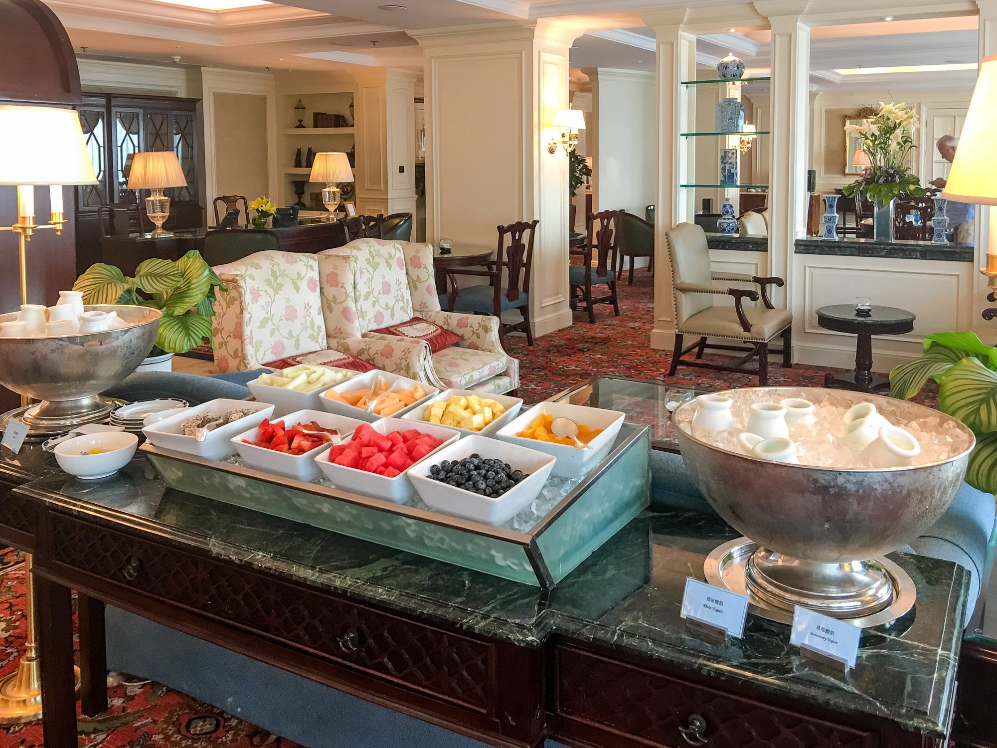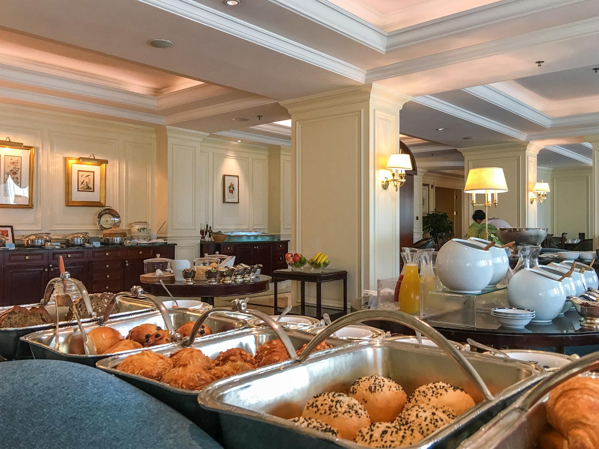 To give you an idea, breakfast includes fresh bread, muffins, pastries, cereals, fruit, a selection of gourmet cheese yogurts, congee, dumplings, salad and a variety of warm dishes like sautéed mushrooms, bacon, sausage and more. In addition, made-to-order pancakes, eggs, French toast, oatmeal can be requested from a menu at the table.