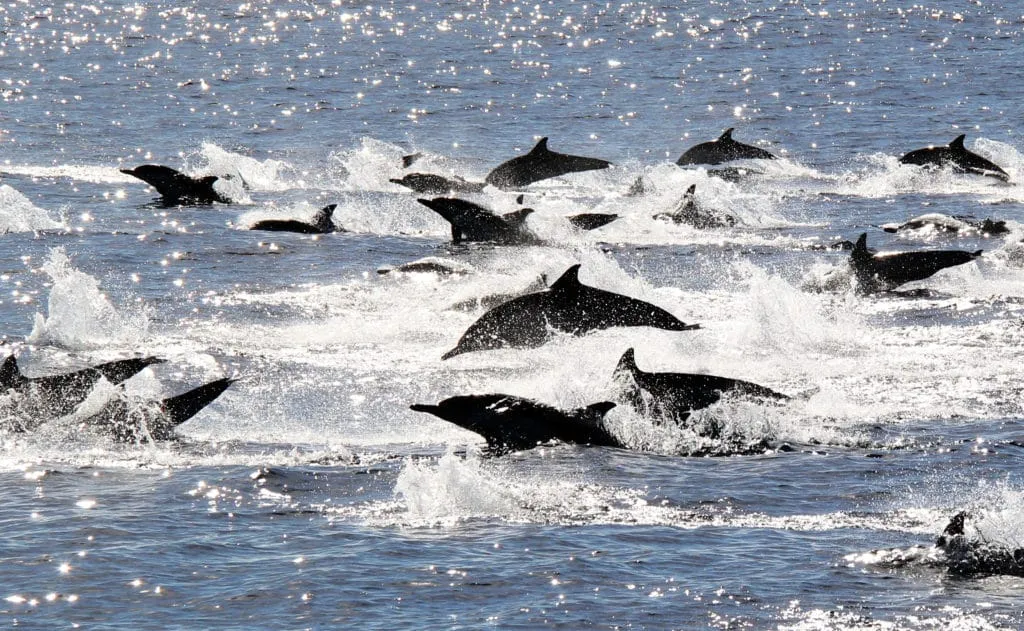 On a two-hour whale-watching cruise, you’ll usually see whales and dolphins. The latter includes common dolphins, bottlenose dolphins, Risso dolphins, and Pacific white-sided dolphins, too.